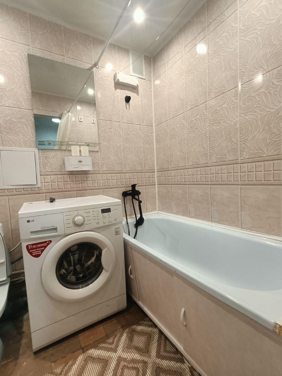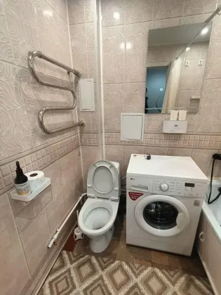 Санузел (в кафеле) установлена стиральная машина.