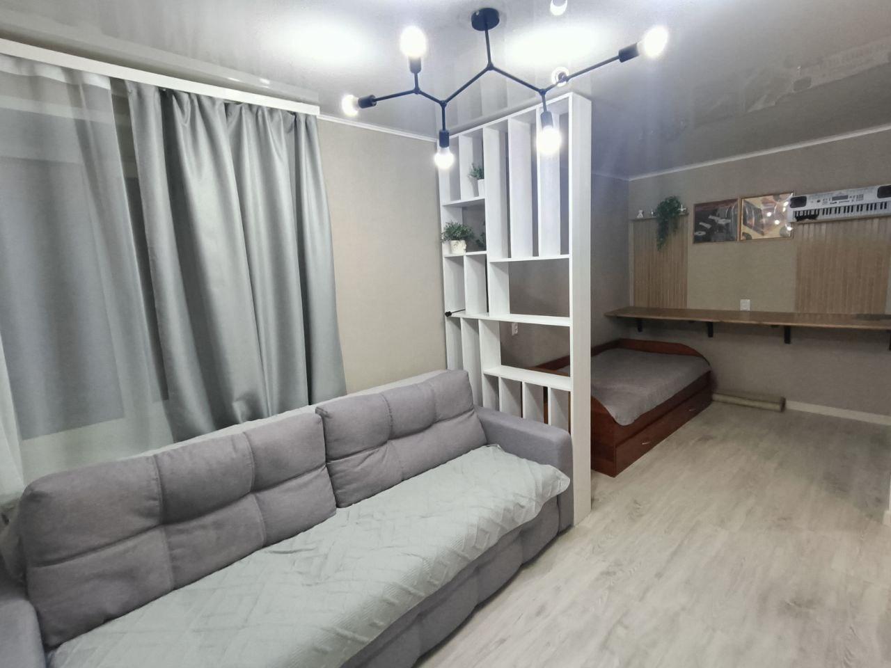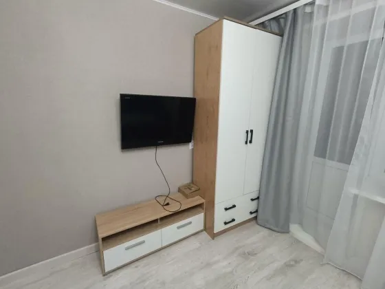 В комнате (выполнено зонирование) есть двухместный удобный диван, софа, телевизор, вместительный шкаф для одежды, тумба прикроватная.